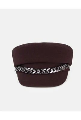 Жіноча кепка з кашеміру в модному відтінку dark wine. Усередині кепки суцільна підкладка з флісу. Модель декорована ланцюжком.