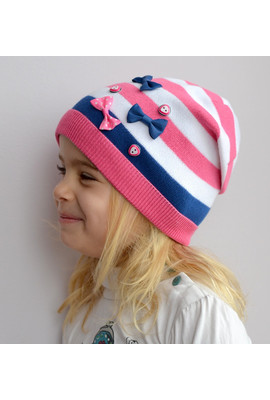 Фасон удлиненный, спереди отделка - бантики и пуговицы. Сзади шапка скреплена зажимом. Зажим этот можно переставить в зависимости от размера головы, а также его можно просто снять.
