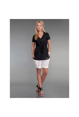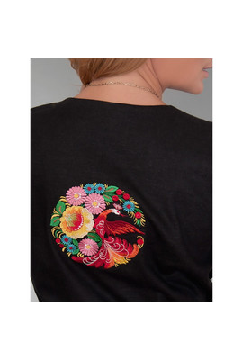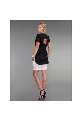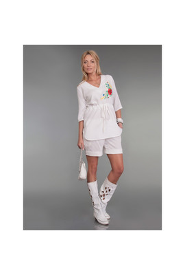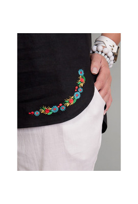 Туника из льна в двух цветах (черный и белый). С коротким рукавом, с кулиской на талии. В модели черного цвета – вышивка на спине и по низу изделия. В модели белого цвета – вышивка на груди. Узор выполнен яркими шелковыми нитями в народном стиле.