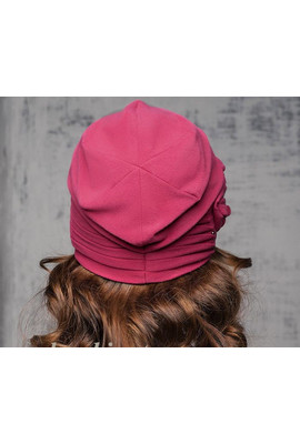 Двойная женская шапка из трикотажного велюрового полотна, удлиненной формы с закрепкой сзади. Задрапирована складками по окружности, придающими объем. Сбоку-цветок со стразами.