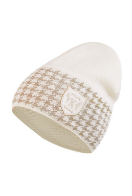 Молодежная одинарная шапка с отворотом из тонкой пряжи. Отворот выполнен принтом "гусиная лапка" из пряжи с люрексовой нитью и эмблемой "Kamea".