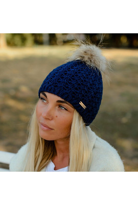 Шапка с помпоном из меха енота - 152-003 тёмно-синий