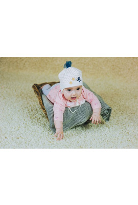 Шапочка для самых маленьких девочек. Аккуратно закрывает ушки и фиксируется благодаря завязкам. Нежный хлопок внутри шапочки не раздражает кожу малышки. За шапочкой легко ухаживать, после стирки она не линяет и не теряет свою форму.