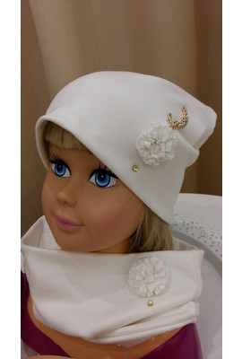 • Модель Жанна состоит из шапки и хомута. Набор в одном универсальном размере. Тянется от 48 до 54 размера. Материал: плотный двойной трикотаж (96% хлопок, 4% эластан).