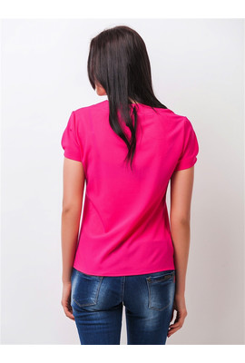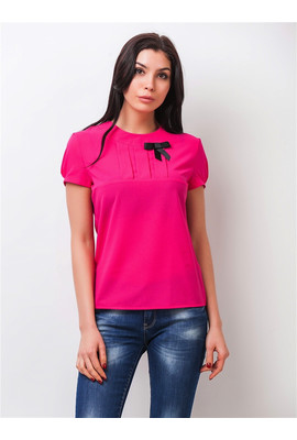 Стильная модель с короткими рукавами и округлым вырезом горловины. Передняя полочка изделия выполнена с небольшими складками на верхней части, также там пришит небольшой черный бантик. Сзади блузка застегивается на 3 небольшие пуговки. Длина изделия - 65 см.