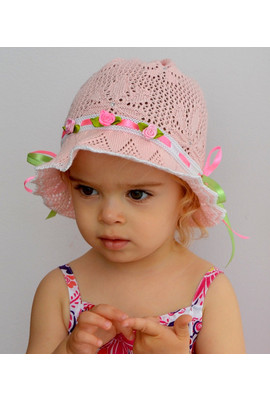 Панамка детская из хлопка. Вязка ажурная, очень эластичная. Панамка хорошо защищает от солнца, в ней не жарко. Хорошо облегает голову. Размер можно регулировать за счет лент. Тянется на р. 50-54. Украшена цветами, стразами. Цвета: белый, розовый с белы...