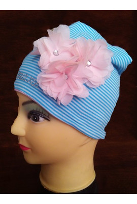 Размеры: 48-50, 50-52, 52-54. Цвет: голубая полоска, розовые цветы. Очень красивая трикотажная шапка для девочки с оригинальным объемными цветами. Модная полоска и удлиненная форма обязательно понравятся маленьким модницам. Приятным бонусом станет изно...