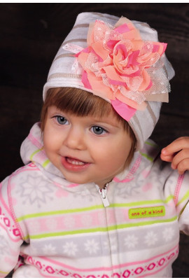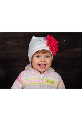 Шапочка дівчача. Тонкий ажурний трикотаж добре прилягає до голови не стискаючи проте тримаючи тепло і форму. А завязочки допоможуть зафіксувати щоб вушка вашої малечі не виглядали. Шапочка легка у прані, квітка не втрачає ні форму ні колір. -