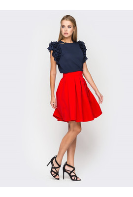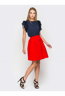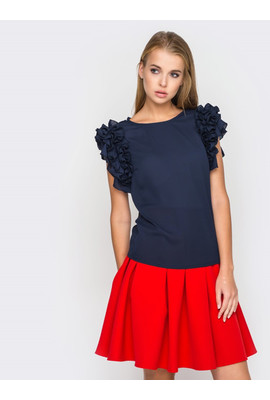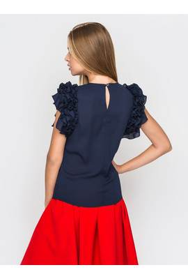 Блузка прямого кроя с короткими рукавами, декорированными рюшами. Из застежек – маленькая пуговка под вырезом горловины на спинке. Длина изделия - 56 см.